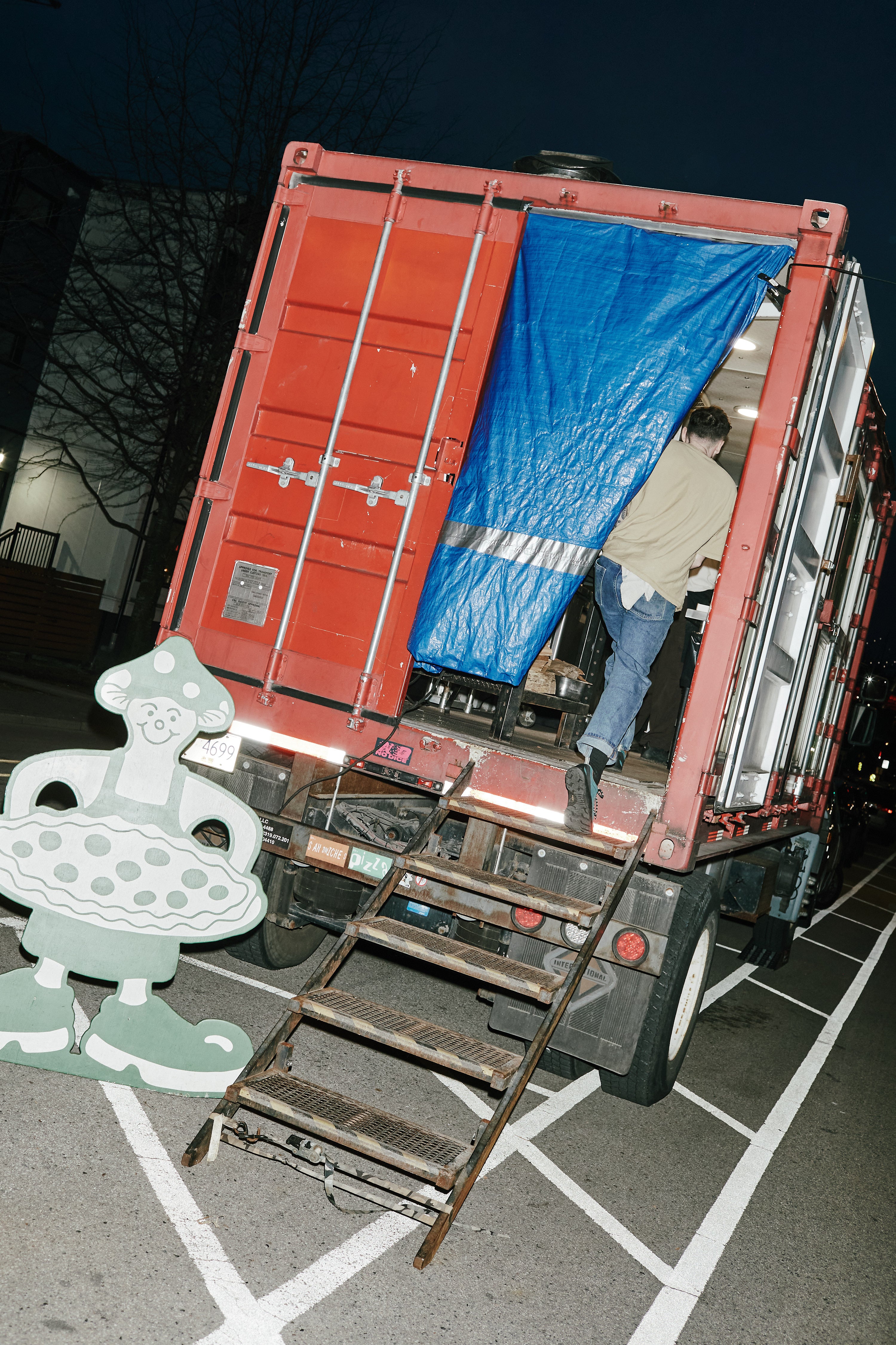 As iconic as the big red truck is, working out of a shipping container brings challenges. Space is tight. It’s impossible to insulate, so it’s frigid in winter and sweltering in summer. On the first day of their week, Wednesday, they typically start warming the oven around 1 PM for a 5 PM service. But once it’s hot, it’ll hold for the rest of the week, needing only about two hours lead time the following days to get back to temperature. Considering the oven lives in an ancient Peterbilt truck with a few hundred thousand kilometres on it, every annual budget includes flour, wine, and toppings, but also some cash set aside for repairs.