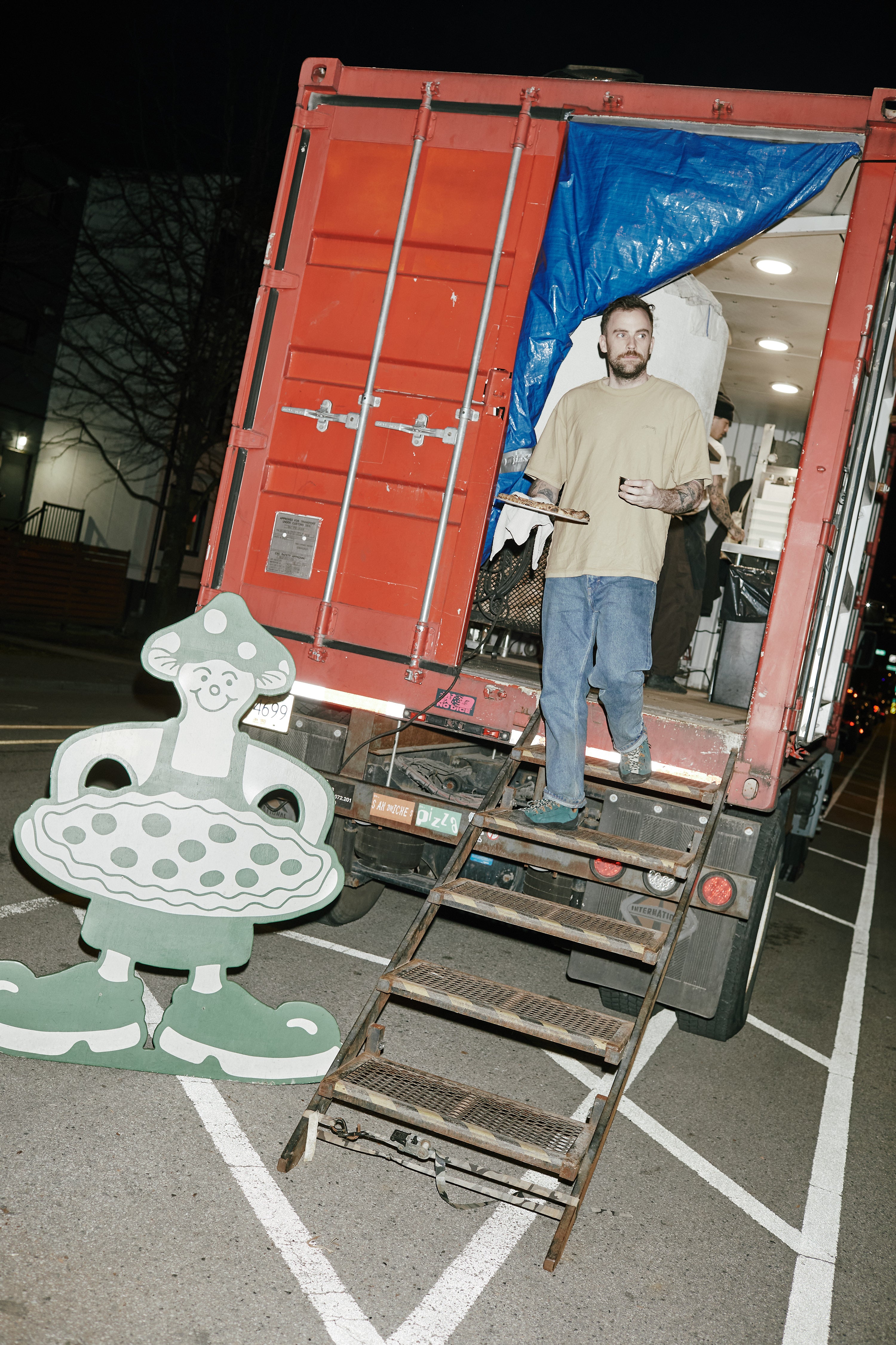 Thank You Pizza is a recognizable spot, even if, technically speaking, it’s mobile. First there’s the big red container truck parked at the corner of Gore and Union in Vancouver. If you’re wondering if you’ve got the right red truck, look out for a smiling green mushroom man holding a pizza nearby. That’s the one. But before you even see any of that, you’ll probably smell campfire smoke from a few blocks away, from the wood-fired pizza oven inside the truck. You’ll hear the chatter coming from one of Vancouver’s most beloved patios, bustling from the first mild spring day to the first (or even second) cold snap in fall.